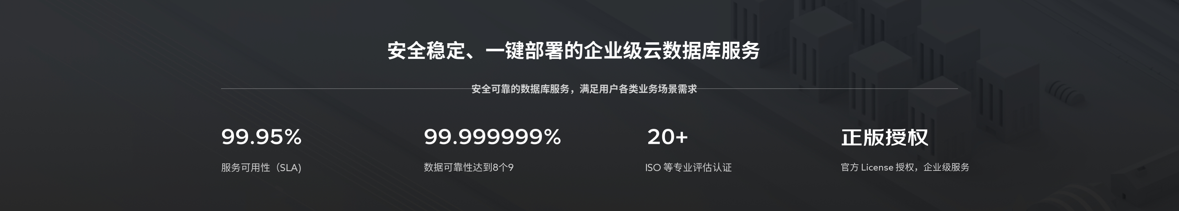 自动故障切换,应用几乎无感知; 每天定时备份,可恢复到7天内任意时间点; 数据库审计,满足合规要求; 性能统计分析,发现潜在性能瓶颈; 单库上云,数据三步轻松上云; 自动监控告警,运维省心省力;