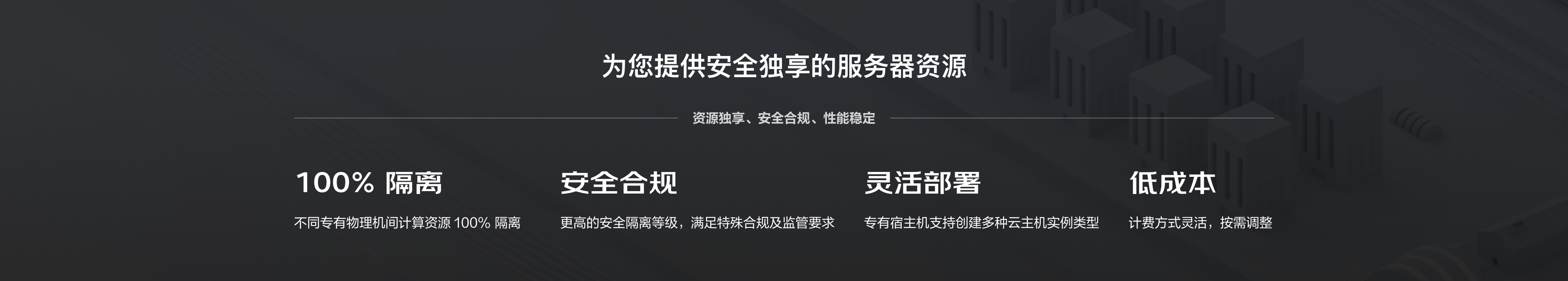 可在资源独享的专有宿主机上创建云主机进行业务部署,实现更高的安全隔离等级,以满足企业特殊的合规监管、安全要求。在金融、政务领域,专有宿主机使用广泛。